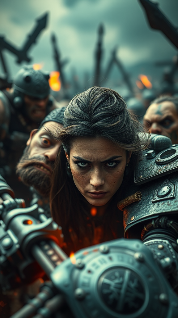 A Space Wolves Space Marine fiercely battles Orcs on an expansive battlefield, capturing the essence of an epic cinematic scene. The atmosphere is charged with dramatic lighting, highlighting every intricate detail in rich, realistic clarity akin to a masterpiece. The focus is sharp and precise, presented in stunning 8k UHD with HDR quality. It's reminiscent of RAW footage from candid cinema, shot with a 16mm cinematic camera. In the heart of this intense action, a determined woman adds a unique dynamic to the scene, with textured skin and remarkably detailed eyes standing out amid the chaotic backdrop.