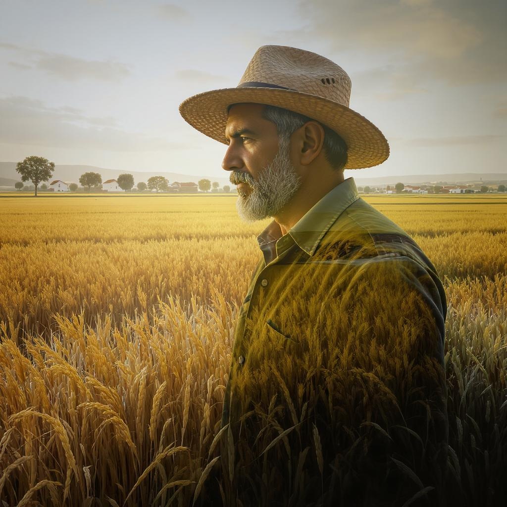 A Spanish farmer standing in his rice fields, bathed in a surreal double exposure effect. The image showcases both the farmer and the golden rice grains, blending harmoniously with hues of earthy brown and vibrant green, creating a dreamlike tapestry that captures the essence of rural Spain. In the background, faint outlines of traditional Spanish countryside architecture merge with the expansive sky, adding layers of depth and cultural context to the scene.