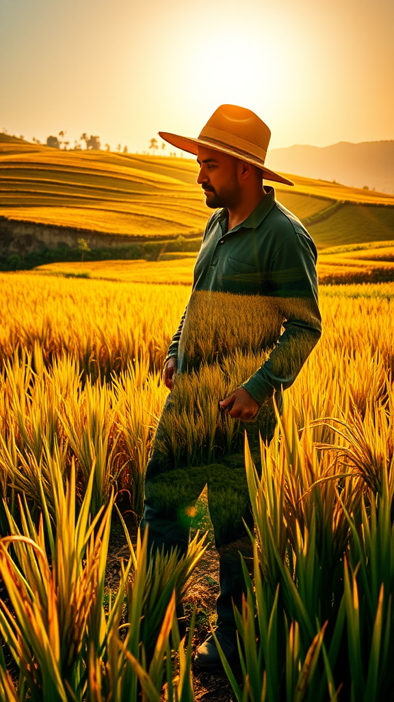A Spanish farmer stands amidst golden rice paddies, his silhouette blending with a colorful double exposure effect, revealing a vibrant tapestry of green and amber hues that reflect the dynamic beauty of the landscape, as the sun casts a warm glow over the scene, illuminating the rich textures of the soil and the vivid colors of the growing rice.