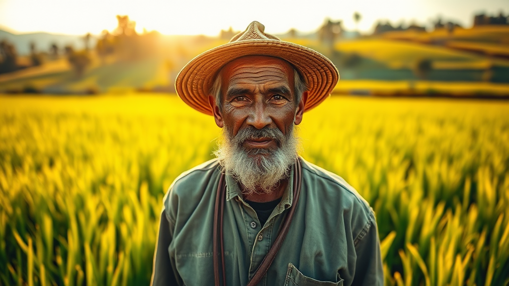 A Spanish farmer stands amidst lush rice fields, the sunlight casting a dramatic double color exposure effect that blends vibrant greens and golden hues, enveloping his weathered features and traditional attire in an ethereal glow. The landscape around him softly blurs into a dreamlike fusion of colors, as if nature itself is painting with the rich tones of the earth and sky, capturing the essence of his deep connection to the land he nurtures.