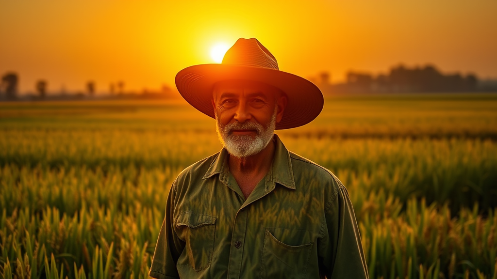 A Spanish farmer stands proudly against a golden sunset, his silhouette intertwined with vibrant images of lush rice paddies, the delicate grains and verdant stalks seamlessly blending with his form to create a harmonious double exposure that celebrates the bond between man and the fertile land he cultivates.