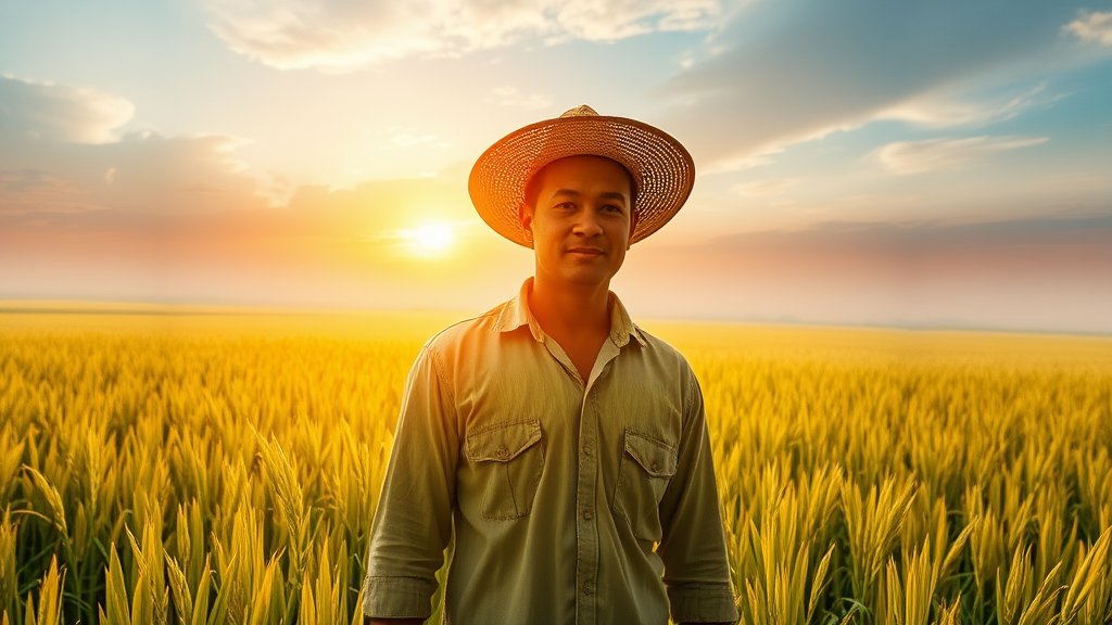 A Spanish farmer stands proudly amidst lush rice fields, his silhouette artfully layered with a double exposure of golden sunlit grains and serene, reflective waters, creating a harmonious blend of earth and cultivation under a sky painted with the soft hues of dawn.