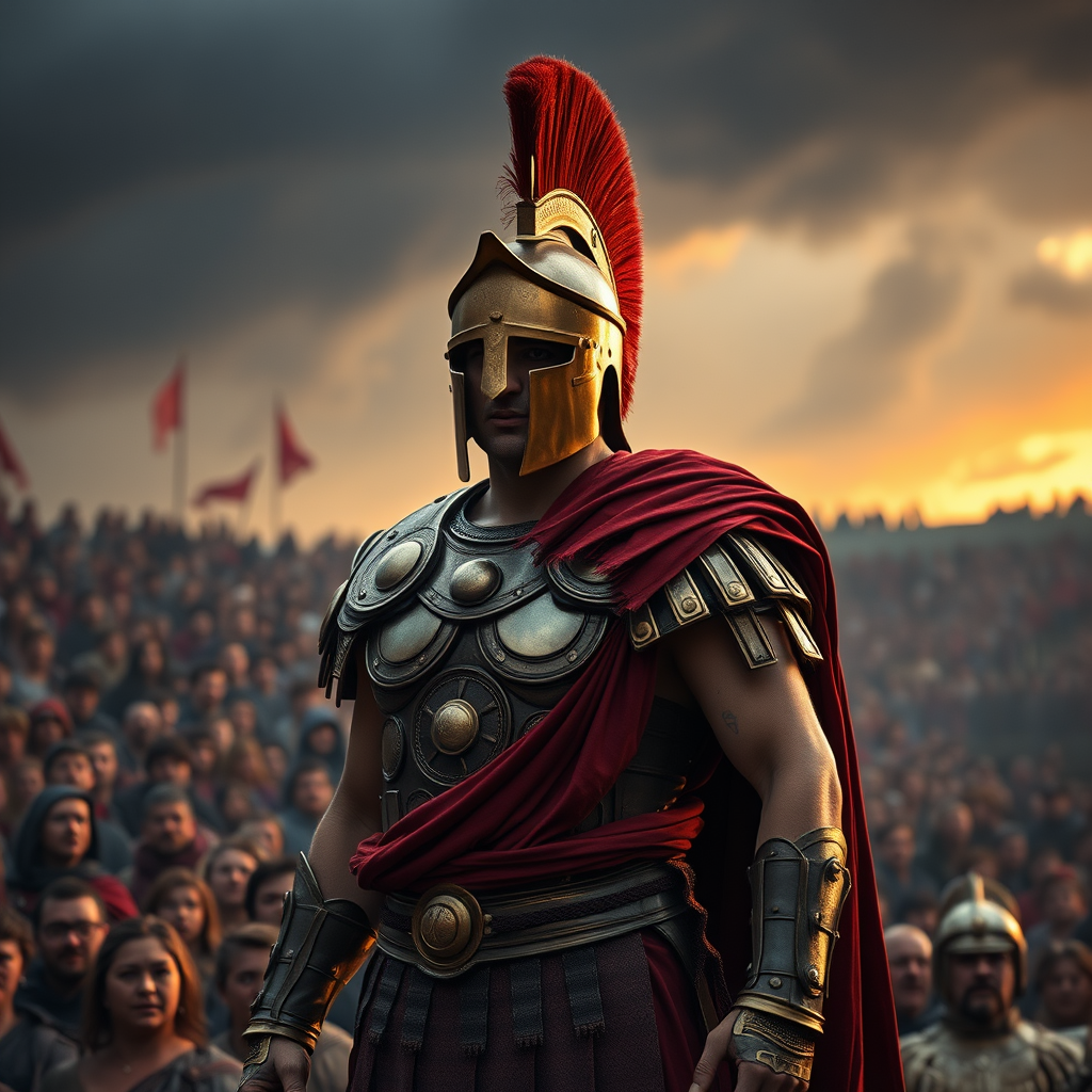 A spartan warrior adorned in dark crimson and gold, standing majestically in a style reminiscent of academic classicism. The scene is captured in stunning 32k UHD resolution, with spectacular backdrops that showcase a distant but impending storm. The warrior's bronze armor gleams playfully under the dim light, capturing the eye with its detailed craftsmanship. Crowds fill the scene, each figure intricately detailed, their expressions a blend of awe and admiration. The overall image bears the authenticity and gravitas of an associated press photo, blending historical grandeur with a modern aesthetic flair.