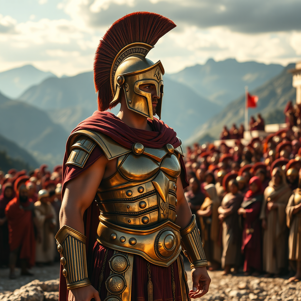 A Spartan warrior stands proudly, clad in elegant dark crimson and burnished gold armor that glimmers under an ancient sun, embodying the essence of academic classicism. The scene unfolds with breathtaking 32k UHD clarity, showcasing spectacular backdrops of majestic mountains and sweeping valleys. The warrior's armor displays a bronze playfulness, its intricate detailing evoking the artistry of ancient craftsmen. In an Associated Press-style photograph, the scene is captured with a vibrant sense of movement as a detailed crowd of spectators, draped in traditional garb, gather to watch. The mood is heightened by the warrior's regal poise, set against a timeless vista that merges history with legend, a testament to the enduring spirit of Sparta.