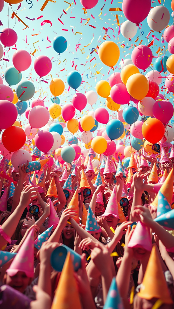 A spectacular display of hyper-maximalist artistry, the scene bursts with vibrant energy and intricate details. The foreground is a lively array of whimsical objects and symbols that exude joy and merriment. Balloons, confetti, streamers, and party hats dance in a kaleidoscope of colors and movement. The atmosphere is playful and dynamic, capturing a sense of carefree celebration. However, the composition's execution is reminiscent of CGI with a touch of surreal, featuring low-resolution, pixelated textures and visible jpeg artifacts. Figures are imperfectly crafted, with oddities like extra fingers, elongated necks, and distorted anatomy, contributing to a slightly morbid yet strangely fascinating spectacle. It presents a curious blend of delightful chaos and peculiar distortions, where the imperfections add an unexpected layer to its exuberant complexity.