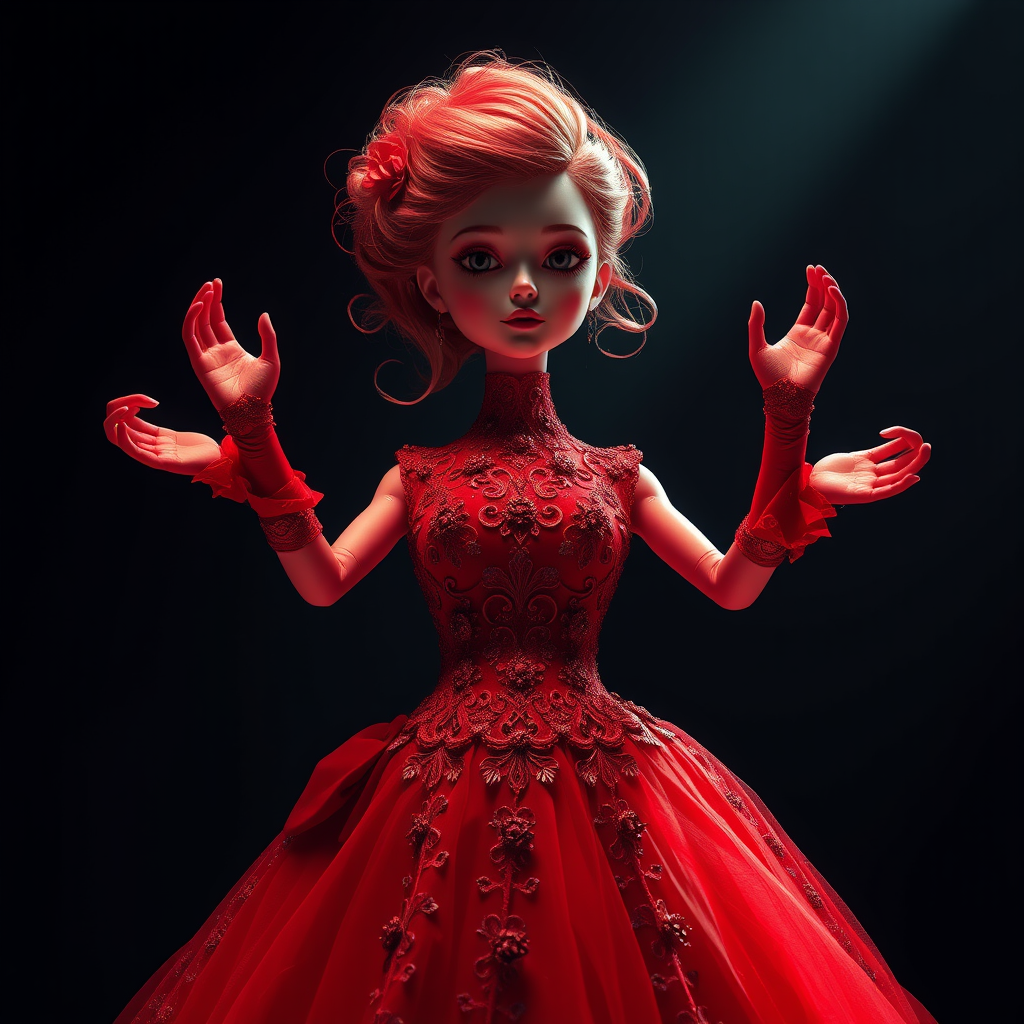 A spectacular red dress captures the spotlight, an awe-inspiring creation that mesmerizes every observer. This exquisite garment, crafted from the finest materials, boasts intricate details epitomizing elegance and sophistication. The striking red hue exudes a rich intensity, instilling power and confidence. The dress enchants with its design flaws, adding a unique charm: cgi, 3d, doll-like render with intentional imperfections such as jpeg artifacts, duplications, and blurred edges. Its unusual anatomy features morphed hands, surplus limbs, and distorted proportions, lending an abstract, experimental appeal to the entire composition.