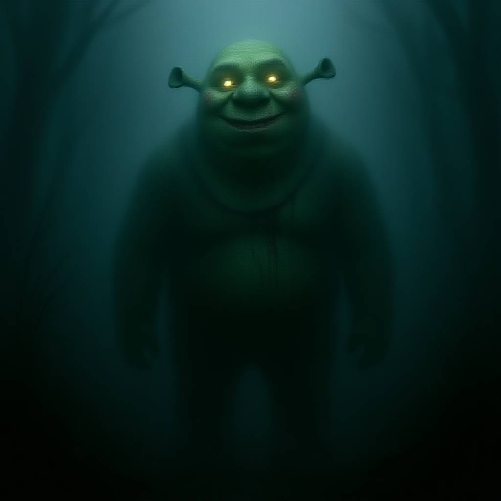 A spectral and sinister figure resembling Shrek stands in a murky swamp, its head tilted with glowing, hollow eyes like those of a soulless creature. Its green skin is slick with slime and streaked with traces of blood. The figure is partially shrouded in the mist and darkness, with an expression that blends anguish and hatred. The atmosphere is chilling, suffused with bluish and dark green hues, unsettling, with decaying vegetation, full body, horror scene, and shades of gray.