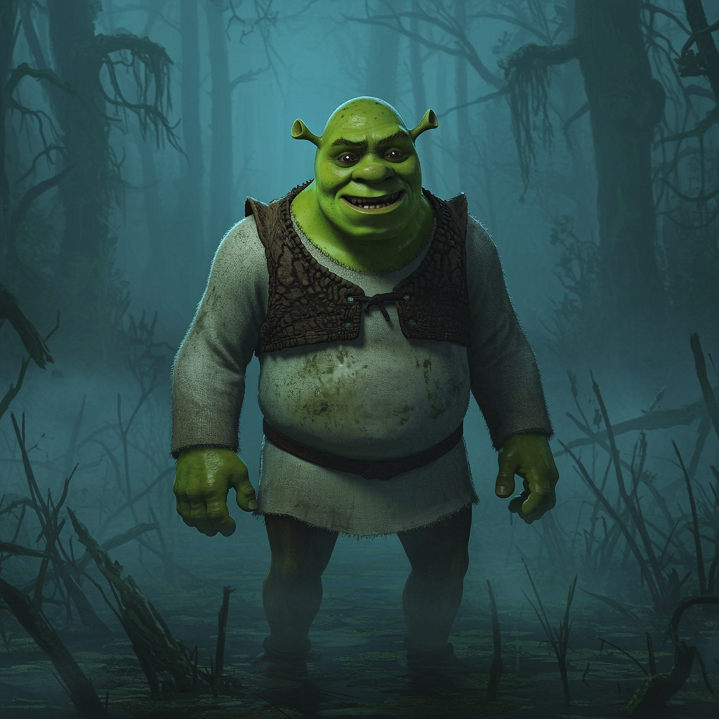 A spectral and sinister Shrek stands in a dark swamp, his head bowed with eyes that gleam eerily like those of a soulless creature. His green skin is slick with slime and mottled with traces of blood. Half-hidden by swirling mists and shadows, his expression is a haunting blend of anguish and malevolence. The atmosphere is chilling, suffused with bluish and deep green hues, creating a disturbing scene amid decaying vegetation, a full-body horror tableau washed in shades of grey.