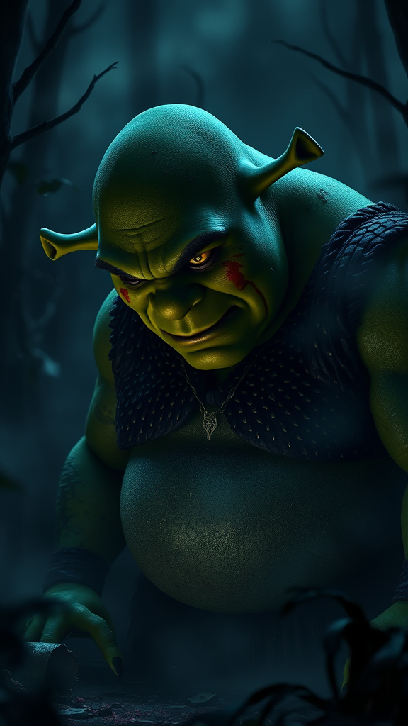 A spectral and sinister Shrek stands in a shadowy swamp, his head bowed with glowing, vacant eyes like those of a soulless creature. His green skin is slick with slime and streaks of dried blood. Half-shrouded by mist and darkness, his expression reveals a haunting blend of anguish and fury. The atmosphere is chilling, suffused with deep blues and dark greens, unsettling, with decaying vegetation all around. A full-body scene of horror, tinged with gray tones.