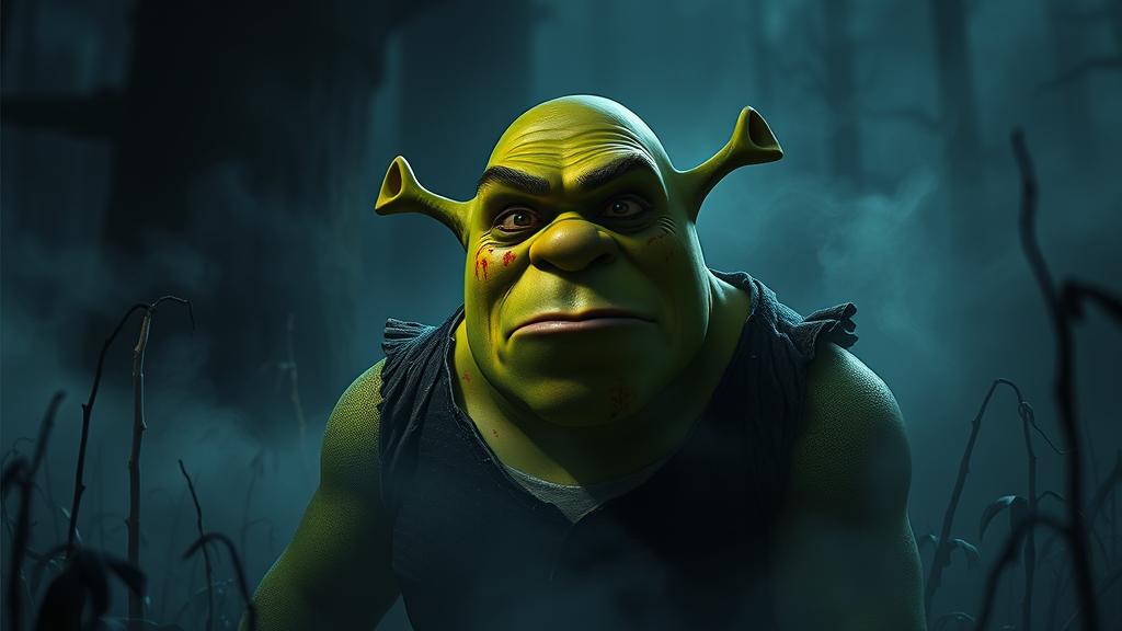A spectral and sinister version of Shrek stands in a murky swamp, his head tilted, eyes glowing vacantly like those of a soulless creature. His green skin is slick with slime and smeared with traces of blood. Half-hidden by the swirling mist and shadows, his expression is a haunting blend of anguish and malice. The chilling atmosphere is painted in hues of deep blue and dark green, creating a disturbing scene amidst decaying vegetation. His full figure looms in the eerie setting, enveloped in a horror-filled gray palette.