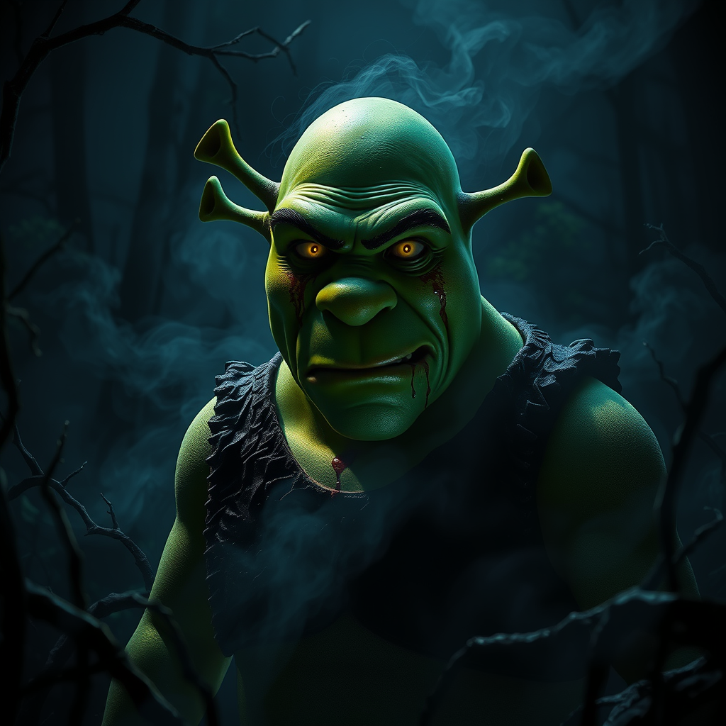 A spectral and sinister version of Shrek stands in a shadowy swamp, his head tilted with glowing, empty eyes resembling those of a soulless creature. His green skin, slick with slime and streaks of blood, glistens eerily. Half obscured by swirling mist and darkness, his expression is a haunting fusion of anguish and malice. The atmosphere around him is chilling, filled with deep blue and dark green tones, exuding a sense of dread amidst the decaying vegetation. The scene, depicted in full figure, is a horror tableau with muted grays weaving through the color palette.