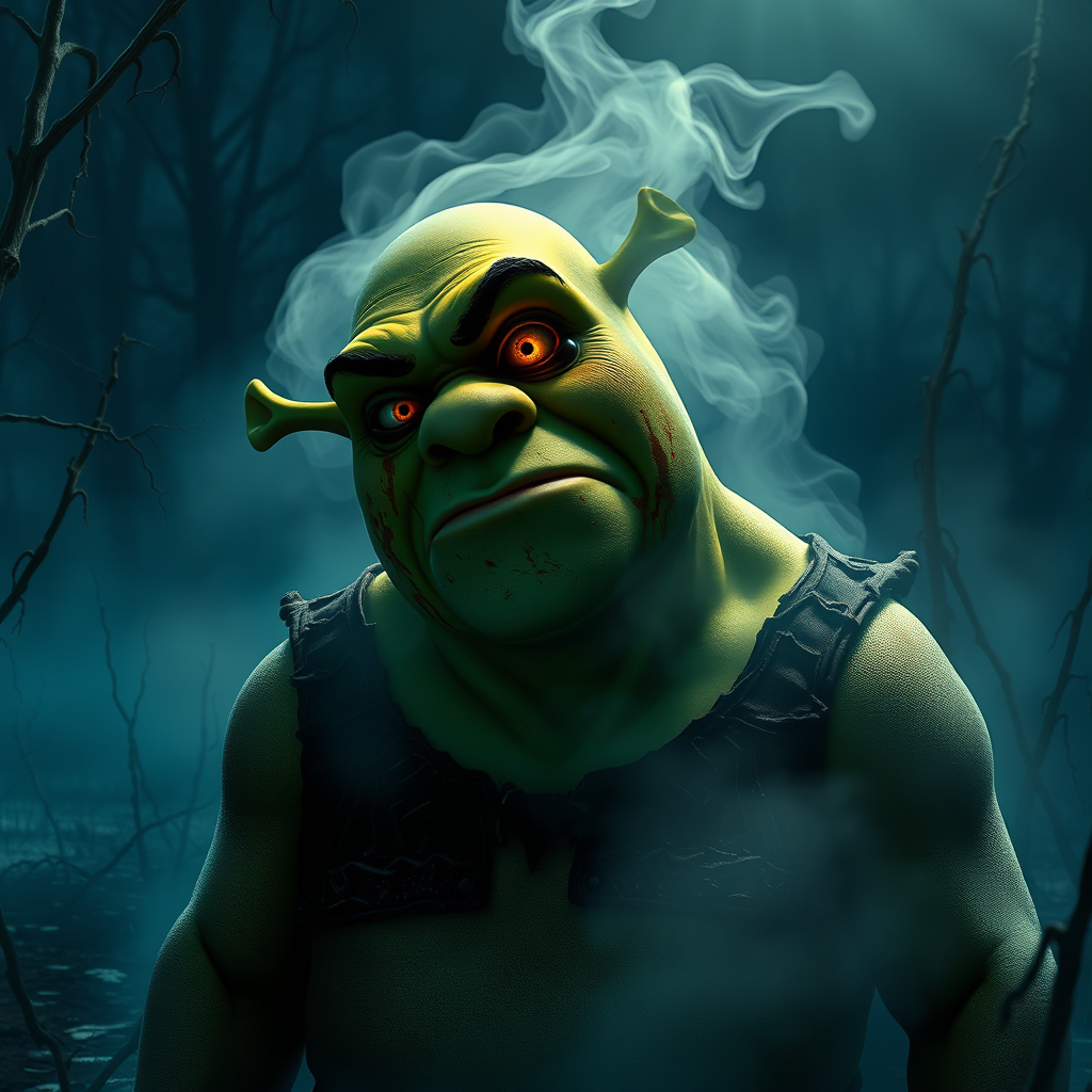 A spectral and sinister version of Shrek stands in a desolate swamp, his head tilted with glowing, hollow eyes resembling those of a soulless entity. His once-green skin is now slick with slime and streaks of darkened blood, partially shrouded by an eerie fog and shadows. His expression conveys a haunting mix of anguish and fury. The environment is chilling, draped in cold hues of blue and deep greens, unsettling with its decaying vegetation. The full figure emerges from this scene of horror, enveloped in gray tones.