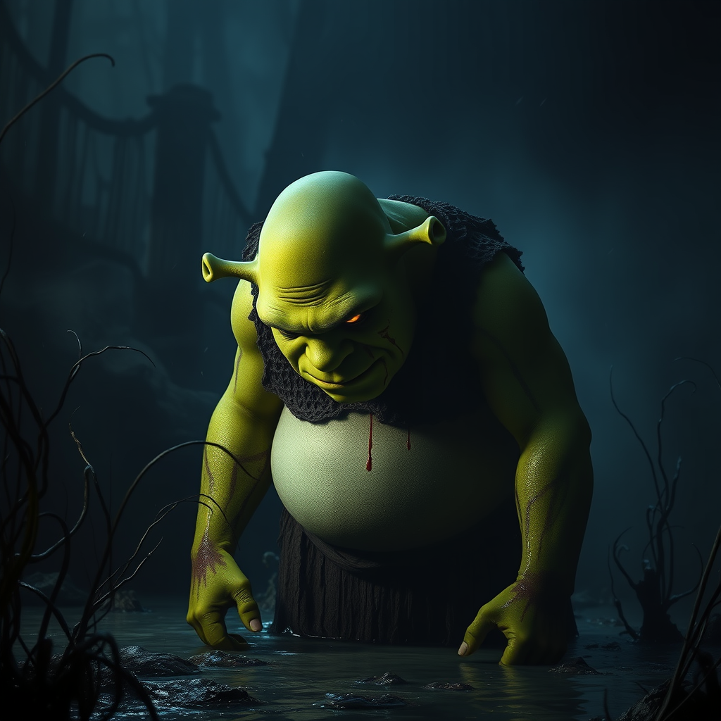 A spectral and sinister version of Shrek stands ominously in a shadowy swamp, his head bowed with glowing, soulless eyes that pierce the gloom. His green skin is slick with grime and smeared with streaks of blood, lending him a macabre appearance. Partially shrouded by swirling mist and shadow, his form exudes a chilling aura of anguish and malice. The air is frigid, tinged with deep blues and dark greens, and the scene is unsettling with decaying vegetation entwining the mire. This haunting image captures a full-body view in an eerie landscape, suffused with somber grays.