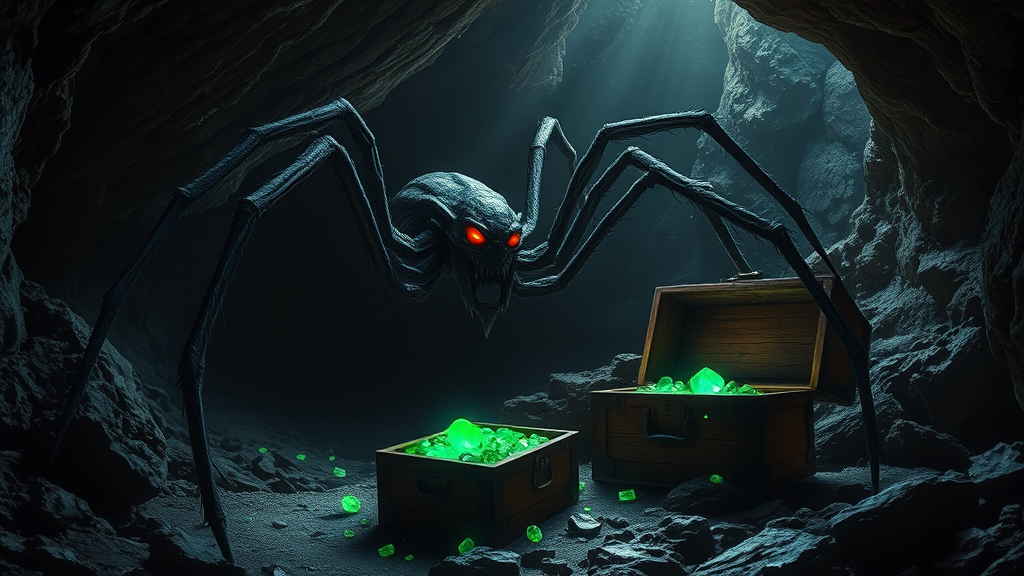 A spectral creature resembling a spider, its elongated limbs enshrouded in shadow and its eyes gleaming a sinister crimson, emerges from the depths of a mysterious cave. The rocky cavern walls glisten with moisture, reflecting the eerie glow of the creature's eyes. In the background, an ancient wooden chest lies open on the uneven ground, spilling over with luminous emeralds that cast a verdant light around them. The atmosphere is steeped in terror, the intricate details of the creature's exoskeleton highlighted in stark relief, capturing the scene in a sharp 4k resolution, while a chilling breeze whispers through the cavern's darkened corridors, encapsulating a fantasy realm on the precipice of the unknown.