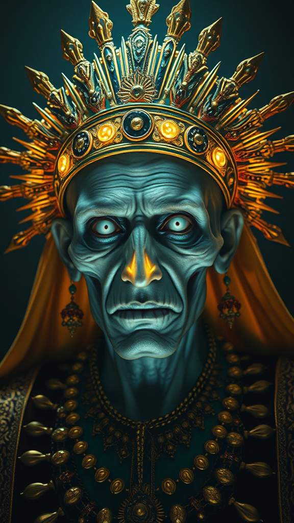 A spectral monarch adorned with a luminous golden crown and opulent necklaces, radiating an aura of ethereal power, is framed by a sunburst headdress that gleams with celestial light. His eyes, vacant and milky, peer out from a visage of pallid, withered skin, embodying a stark contrast to the vibrant regalia. Bathed in intense, atmospheric lighting, every detail of this regal apparition is rendered with stunning photorealism, set in an 8k resolution, with a towering, elongated aspect ratio that emphasizes the imposing presence of this undead sovereign.