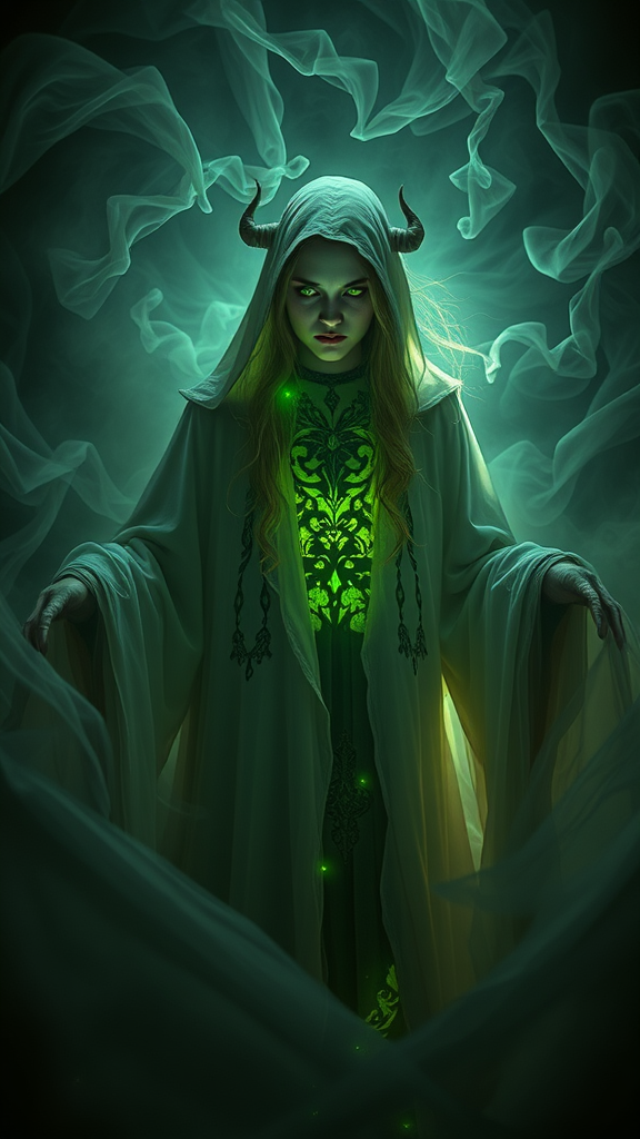 A spectral sorceress stands amidst a swirling vortex of ethereal apparitions, her luminous green eyes pierce through the dim light, casting an unearthly glow. Her robes billow around her, illuminated by a cinematic sheen that highlights the intricate patterns woven into the fabric. The atmosphere is steeped in a foreboding aura, shadows coalesce in the corners, whispering secrets of the afterlife. Her presence emanates a chilling power, commanding the spirits that encircle her like a ghostly entourage, their translucent forms flickering in and out of existence in the oppressive, eerie gloom.
