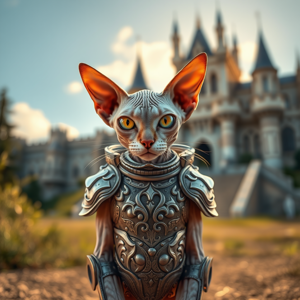 A sphynx cat in intricately designed armor stands confidently outdoors with a majestic castle in the background, captured in a RAW photo with sharp focus using a DSLR. The image boasts 16k resolution, showcased in vibrant UHD and HDR quality, highlighting every detail. The atmosphere is fantastical, with the sun casting a golden glow over the scene. The cat's striking eyes maintain a fierce and noble expression, perfectly complementing its regal armor.