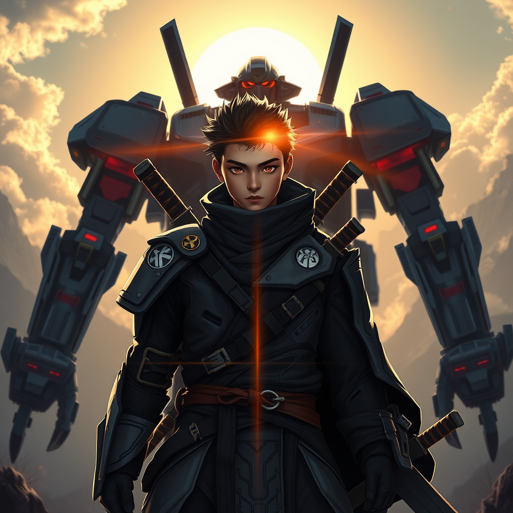 A spirited young man dons a sleek, futuristic samurai suit, reminiscent of heroic figures in Soviet-era posters. His determined gaze cuts through the dawn's first light, illuminating his path. Behind him, an array of swords and shurikens hints at his formidable skills. Towering in the backdrop stands an imposing Ninja Mech, its intricate design blending seamlessly with the anime and manga-inspired graphics. The mood is set by dark, dramatic colors, while the scene's high level of detail is brought to life through offset printing techniques. The poster captures the essence of high-definition CMYK quality, evoking a sense of adventure with cinematic lighting and a joyous undertone, all in a striking 8K resolution and designed in a portrait-oriented composition.