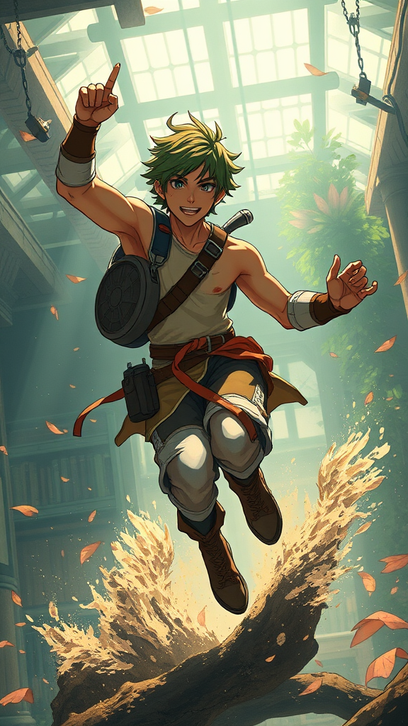 A spirited young man in his prime, immersed in the rhythmic energy of the gym, his form echoing the enchanting aesthetics of Miyazaki's Nausicaa, infused with the adventurous spirit of Breath of the Wild. The scene captures an epic composition where vibrant hues and dynamic lines animate his every movement, exuding strength and determination amidst a world filled with fantastical details. The gym, a blend of surreal elements with nature-inspired motifs, envelops him, narrating a visual tale of perseverance and youthful vigor.