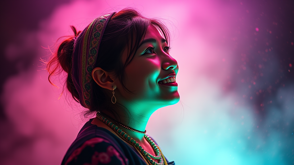 A spirited young Mapuche woman pondering her thoughts, embodying passion, joy, and quirkiness, enveloped in a spectrum of pastel hues. The scene is perceived through a lens of light painting, bokeh effects, and hyperspectral imagery, captured with a telephoto perspective. Her vibrant essence radiates electric colors and fluorescent tones, enhanced by cinematic film lighting. Tiny particles of dust dance in the air, creating an electric atmosphere, all intricately refined in post-processing, presented in an elongated 9:16 aspect ratio.