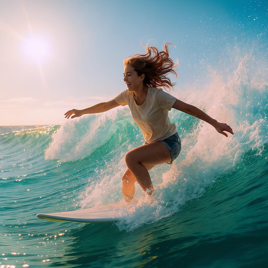 A spirited young woman rides the crest of a vibrant ocean wave, the salty wind tugging playfully at her hair as the sun casts a golden glow over the shimmering water below.