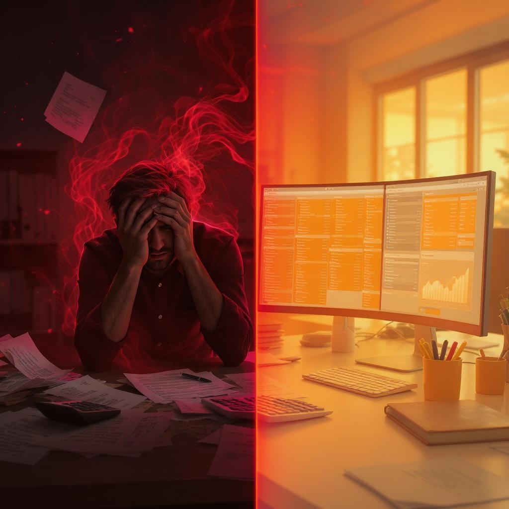 A split-screen scene showcases a stressed accountant on the left, immersed in a swirling red glow, surrounded by scattered documents, calculators, and signs of exasperation. On the right, the scene shifts seamlessly to a calm, organized office environment highlighted by serene orange hues, featuring high-tech monitors displaying clear, organized data and neatly aligned office supplies. The transition between the panels reflects a gradient from a tense red to a soothing orange, symbolizing the transformation from chaos to calm efficiency.