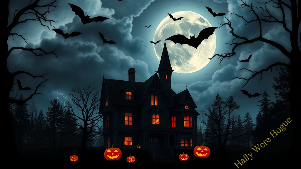 A spooky haunted house looms in a stormy, moonlit forest, its silhouette stark against the lightning-laden sky. Flickering, colorful jack-o-lanterns cast an eerie glow at the entrance, their carved faces illuminated with mischievous grins. Bats flutter ominously overhead, silhouetted against a silver moon partially veiled by rolling, dark clouds. The wind howls through the trees, their branches creaking and swaying like skeletal fingers reaching into the night.