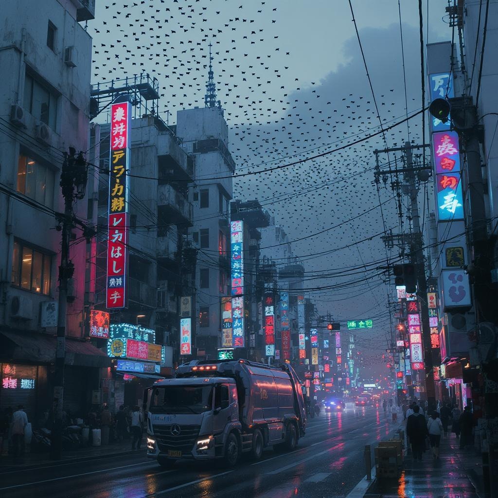 A sprawling cinematic wide of a bustling city street reminiscent of Tokyo, where the buildings, though slightly weathered, are adorned with flickering neon signs and faint holographic ads casting a kaleidoscope of colors on the pavement. In the sky above, a flock of birds gracefully weaves through the urban landscape, while below, the rhythmic hum of a futuristic garbage truck echoes as it trundles past, its lights pulsating gently in the evening light.
