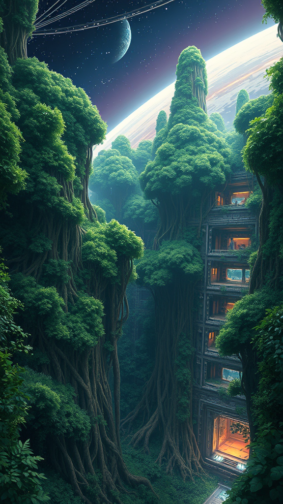 A sprawling expanse of lush vegetation nestled within a colossal sci-fi space station, where towering trees with intricately braided roots entwine the walls, creating a tapestry of green. The vast multistory structure showcases vegetation of immense scale, set against the backdrop of endless cosmic vistas. As the sky transitions into dusk, the station exudes a dystopian ambiance, evoking the game art style reminiscent of Tsutomu Nihei's works like Blame! and Sidonia no Kishi. The scene captures anime and manga-inspired graphics, marked by an abundance of small, hyper-detailed elements, delivering the highest quality visuals. The environment is bathed in flashing and ambient lighting, offering a third-person view that reveals optical fibers woven through the station's architecture. The imagery is rendered in stunning 8K Ultra-HD, ensuring every detail is captured with precision, creating an immersive experience devoid of any human presence.