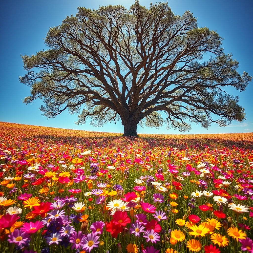 A sprawling field brimming with a kaleidoscope of wildflowers bursts into view, each bloom a radiant splash of color shimmering under the gentle caress of sunlight. The flowers, a diverse array of sizes and hues, sway with the breeze in a harmonious dance. Standing majestically at the field's center is a towering tree, its vast branches casting a protective embrace across the landscape, stretching skyward in intricate patterns against the azure expanse. The scene exudes an ethereal tranquility, inviting observers to lose themselves in the vibrant beauty of nature's tapestry.
