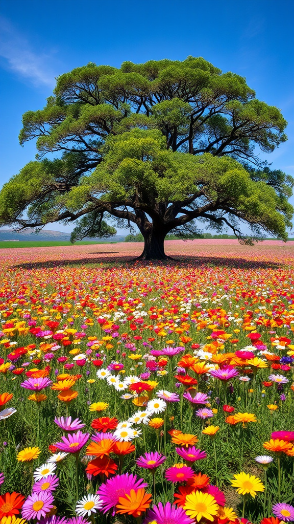 A sprawling field of wildflowers bursts with vivid colors, each flower glowing warmly under the sun's embrace. Unique blossoms of varying sizes and hues dance across the landscape in a harmonious display. At the heart of this vibrant meadow stands a majestic tree, its vast branches stretching wide and high, casting gentle shadows across the flowers. The tree towers over the field, its presence both commanding and nurturing, creating a striking contrast against the endless sky above.