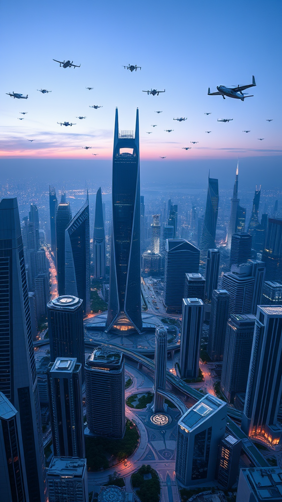 A sprawling futuristic cityscape at twilight, dominated by sleek skyscrapers with clean, geometric lines and smooth surfaces reflecting ambient light. The skyline is dotted with various flying vehicles and interconnected sky bridges. The color palette consists of cool blues, silvers, and muted purples, creating a serene and sophisticated atmosphere. Hints of greenery and minimalist public spaces interspersed throughout offer a touch of nature amidst the urban setting. Subtle glowing lights accentuate key architectural features, enhancing the modern and advanced aesthetic.