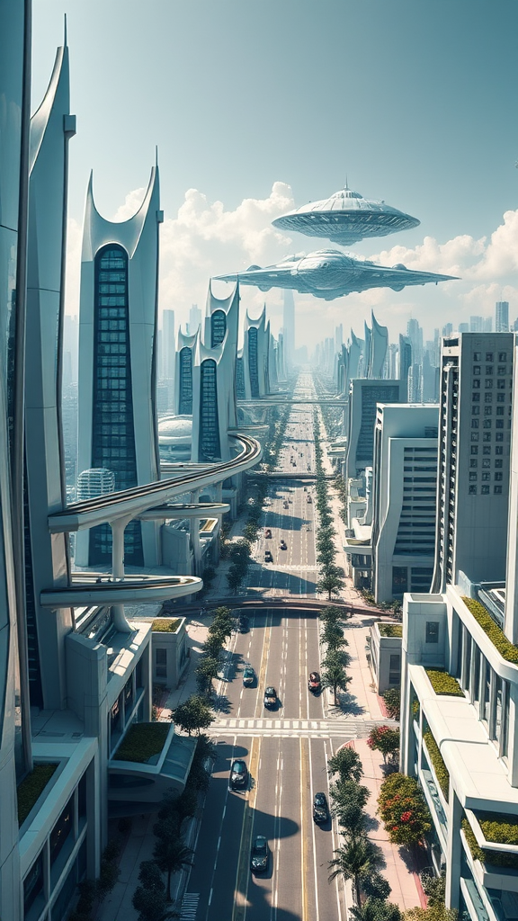 A sprawling futuristic cityscape featuring towering skyscrapers with smooth, aerodynamic silhouettes and glowing windows, interconnected by sleek monorails. Hovering vehicles zip through the air in organized lanes. The streets below are impeccably clean, lined with minimalist architecture and lush greenery integrated into the design. The color palette includes shades of silver, teal, and muted white, creating a cool and modern ambiance. In the distance, a massive spaceship with streamlined contours hovers gracefully above the city, its surface adorned with geometric patterns that pulse with energy.