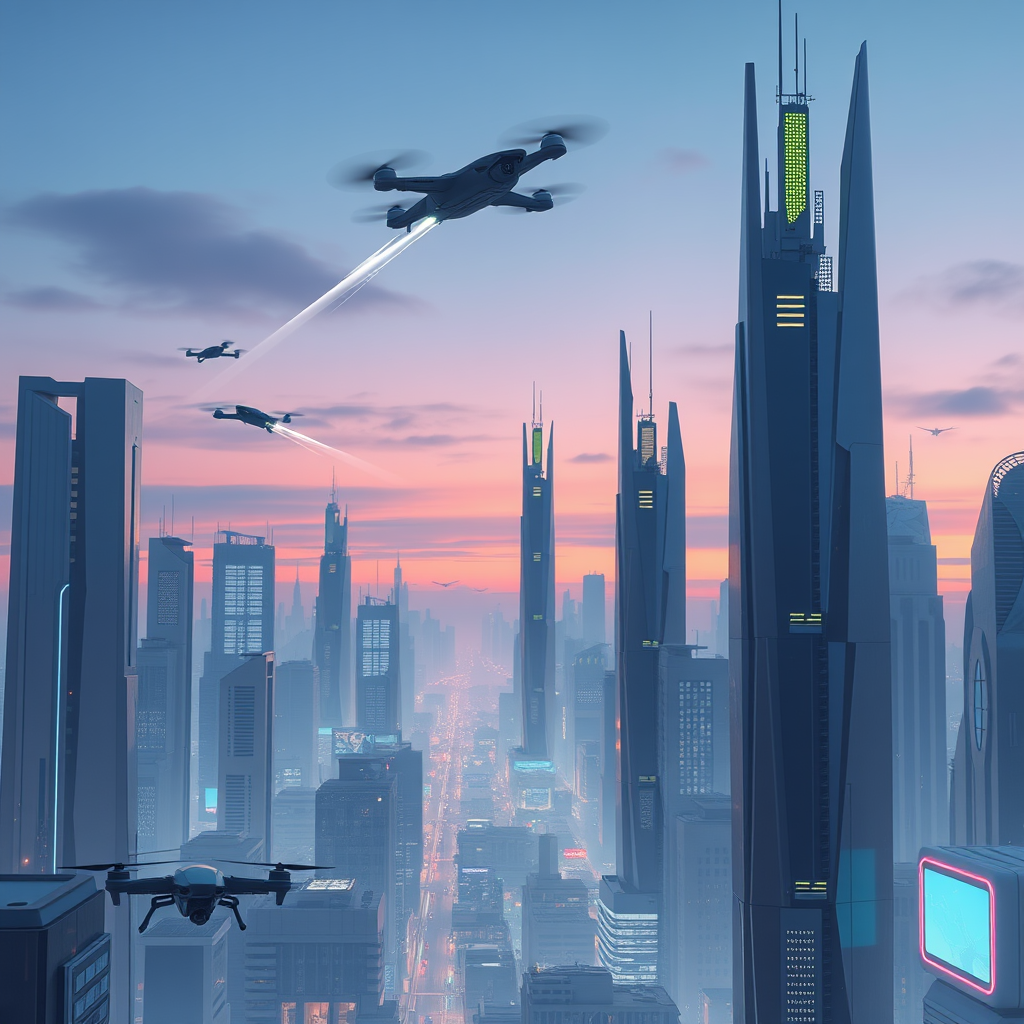 A sprawling futuristic cityscape under a twilight sky, featuring sleek skyscrapers with geometric designs and glowing windows. Flying vehicles zip through the air, leaving trails of light. The scene is dominated by clean lines and simple shapes, reflecting modern architecture. A limited color palette of cool blues, silvers, and gentle purples adds a serene yet advanced atmosphere to the technology-infused setting. In the foreground, a few hovering drones can be seen performing various tasks, while neon signs pulse softly in the background.