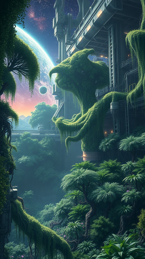 A sprawling landscape of dense, lush vegetation within a colossal sci-fi space station, where towering trees intertwine their roots into the metallic walls. Gigantic flora dominates the view in this multilevel space environment, set against the backdrop of the infinite cosmos at dusk. This dystopian setting is rich in game art quality reminiscent of Tsutomu Nihei's style, with influences from works like Blame! and Sidonia no Kishi. The scene is rendered in anime and manga graphic style, brimming with intricate small details and hyperdetail. The lighting alternates between flashing and ambient, casting dynamic shadows and highlights. The perspective is from a third-person view, capturing the vastness in 8K Ultra-HD. Optical fibers weave through the landscape, adding to the futuristic ambiance. The environment is devoid of human presence, emphasizing the majesty of nature overtaking technology.