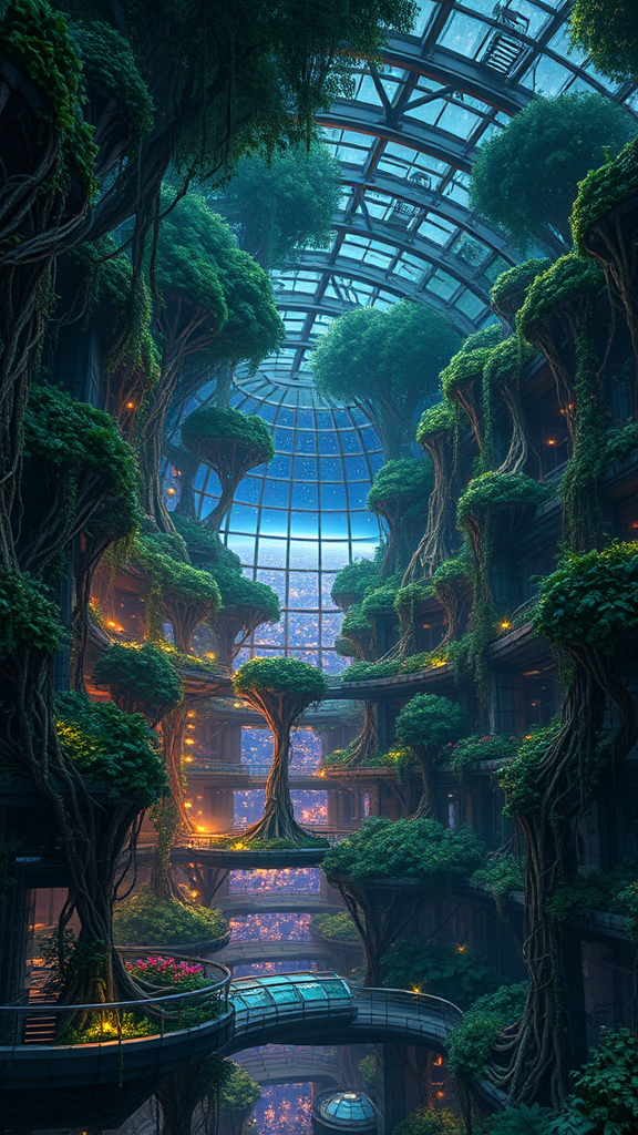 A sprawling network of lush vegetation thrives within a colossal sci-fi space station. Magnificent trees with roots intricately weaving up and down the metallic walls create a stunning tapestry of nature and technology. Vegetation exhibits gigantism, filling the multistory space with their grandeur. Beyond the glass dome, the infinite expanse of space glistens at dusk, casting an ethereal glow over the dystopian environment. The scene evokes the artistry of Tsutomu Nihei, reminiscent of works like Blame! and Sidonia no Kishi, blending anime and manga aesthetics with intricate, hyper-detailed drawings. The setting bathes in ambient lighting, occasionally flickering from high-tech components, creating a dynamic ambiance. The perspective reveals a third-person view in crystal-clear 8K Ultra-HD, showcasing every nuance, enhanced by the ethereal glows of optical fiber woven through the space station.