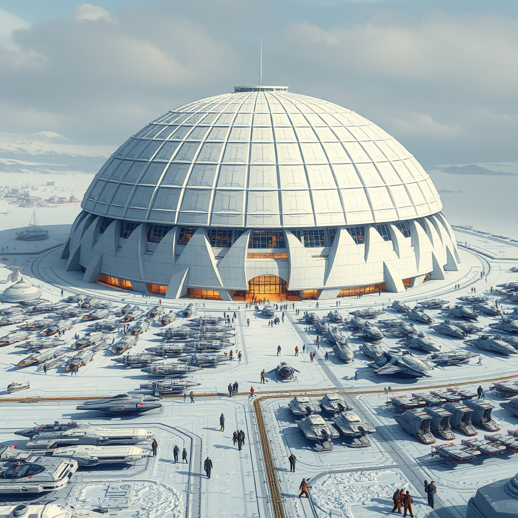 A sprawling spaceport stretches across a snow-dusted landscape, bustling with spaceships of all shapes and sizes parked in neat rows. People clad in futuristic attire navigate the busy area, their breath visible in the frosty air. Dominating the foreground is an immense dome-shaped structure, a masterpiece of modern architecture crafted from sleek white and grey stone, interwoven with expansive panels of shimmering glass. The impressive edifice reflects the chill of the season, yet emanates a warm glow from within, suggesting a hive of activity and advanced technology. The scene is alive with movement and the hum of engines, capturing the vibrant essence of an interstellar hub in a wintery setting, reminiscent of the dynamic style of Craig Mullins.