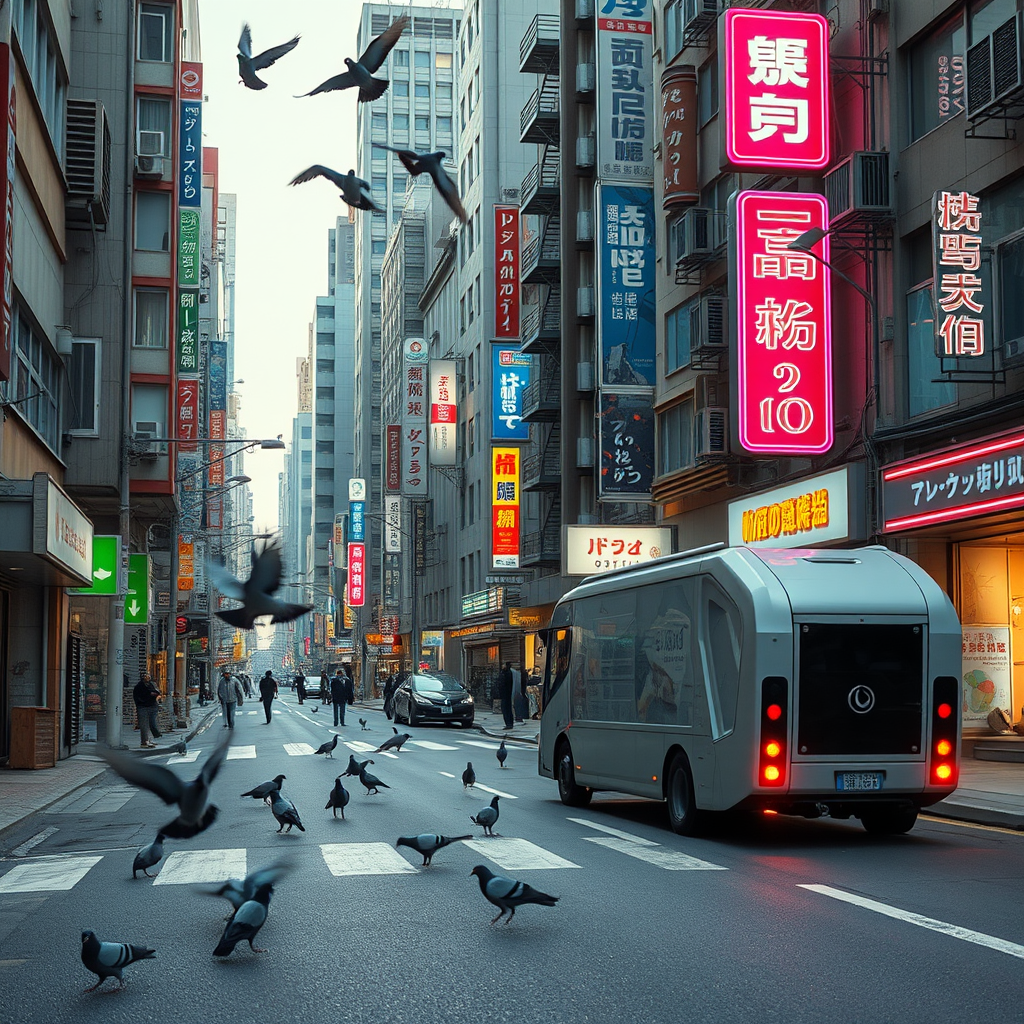 A sprawling Tokyo-inspired city street stretches wide in a cinematic still, lined with slightly worn buildings that boast futuristic touches like vibrant neon signs and faintly flickering holographic ads. Pigeons flutter gracefully across the scene as a sleek, autonomous garbage truck hums quietly past, adding a whisper of modern innovation to the urban landscape.