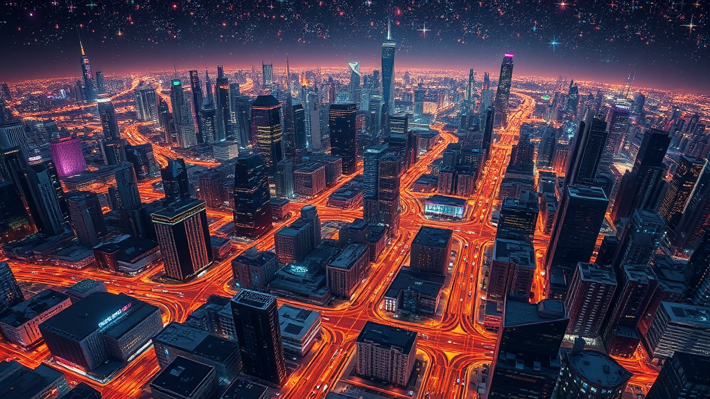 A sprawling urban landscape intricately woven into the circuitry of a computer motherboard, where towering skyscrapers resemble microchips and streets are etched into the copper pathways, glowing with iridescent energy as digital cars zip along hyper-connected routes, all under a sky illuminated by pulsating LED stars.