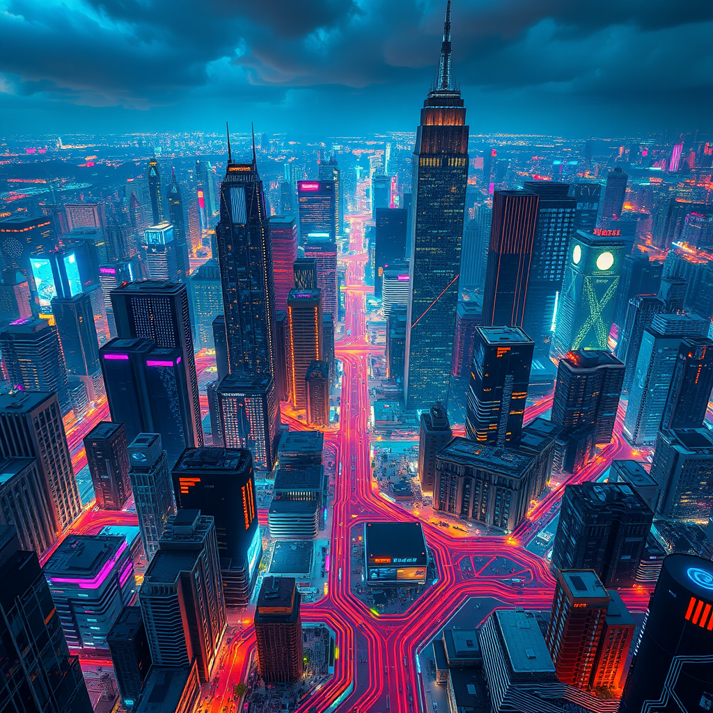 A sprawling urban landscape made entirely of interconnected computer components, where vibrant circuits serve as bustling streets, towering skyscrapers are built from stacks of microchips, and neon pathways trace the edges of silicon plazas in this futuristic motherboard metropolis.