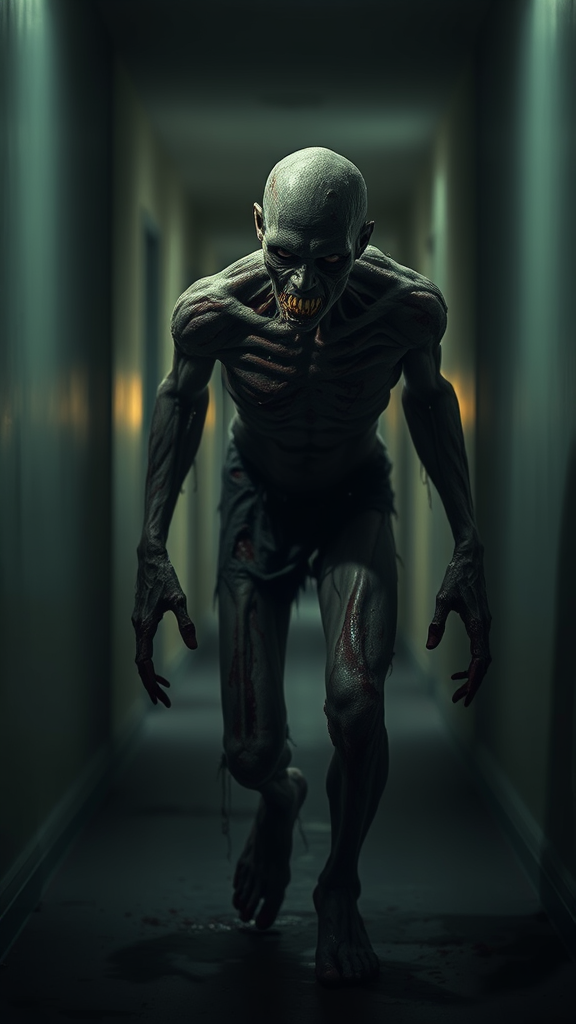 A stage four zombie shuffles out from the shadows of a dimly lit room, its decaying skin rendered in haunting realism, highlighted by soft volumetric lighting that casts eerie patterns. The atmosphere is tense and palpable, with an unsettling quiet pervading the scene. The background is a blurred and indistinct hallway, adding depth while maintaining low contrast, creating an ominous setting that accentuates the highly detailed features and unsettling aura of the creature as it advances forward.