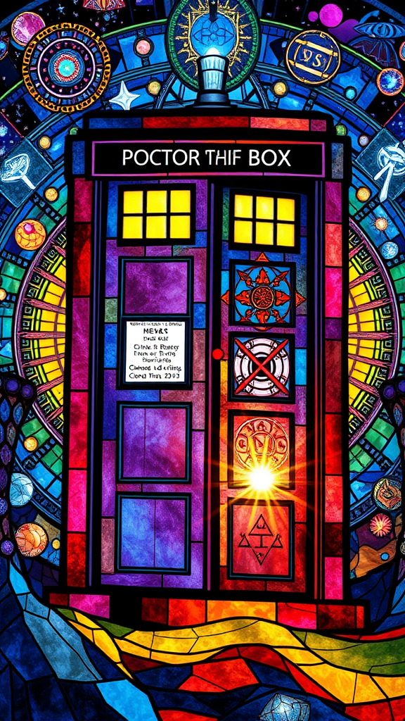 A stained glass depiction of the TARDIS, intricately detailed with elements of Gallifrey, capturing the essence of Doctor Who, vibrant colors creating a mosaic of sparkling reflections; each piece of glass telling its story. Hyper-detailed illustrations of cosmic patterns and ancient symbols radiating from the TARDIS, surrounded by a celestial aura with a sense of motion, as if caught in a timeless journey. The scene embodies a fusion of science fiction and artistry, with a glowing atmosphere and shimmering light play.