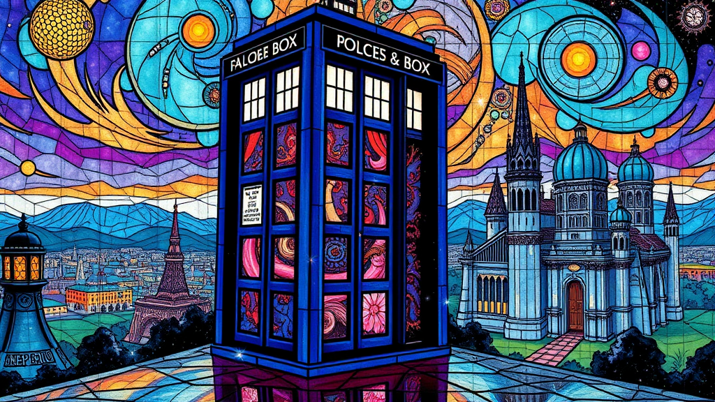 A stained glass depiction of the Tardis with intricate detailing, inspired by Dr. Who, set against the backdrop of Gallifrey's vibrant landscape. The scene is filled with sparkling reflections and luminous colors that dance across the surface, capturing the essence of time travel. The design features hyper-detailed illustrations, showcasing the grandeur of the Gallifreyan cityscape in the background, with its towering spires and swirling skies. The image is infused with a sense of wonder and mystery, blending elements of science fiction with the timeless art of stained glass, accentuated by the play of light and shadow, creating a dynamic, otherworldly masterpiece.