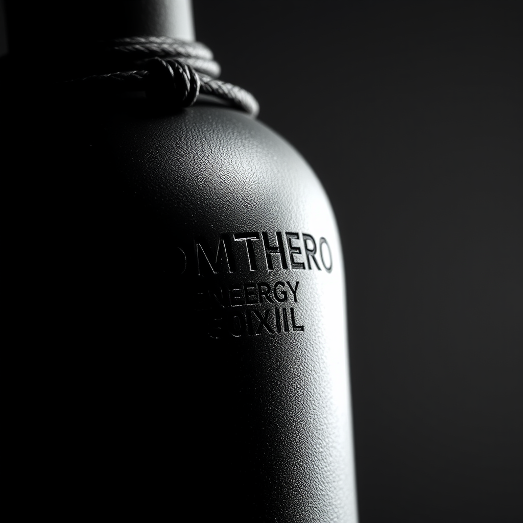 A stark close-up of a matte charcoal black bottle showcases the embossed text, "PROMPTHERO β ENERGY ELIXIR β 50 ML β HANDLE WITH CARE". The bottleβs textured surface captures dramatic lighting, creating a play of gentle highlights and profound shadows. Around its neck is a dark leather cord, enhancing its rustic, practical charm. The right side transitions into a sleek, misty gradient, providing a contemporary, sophisticated editorial look.