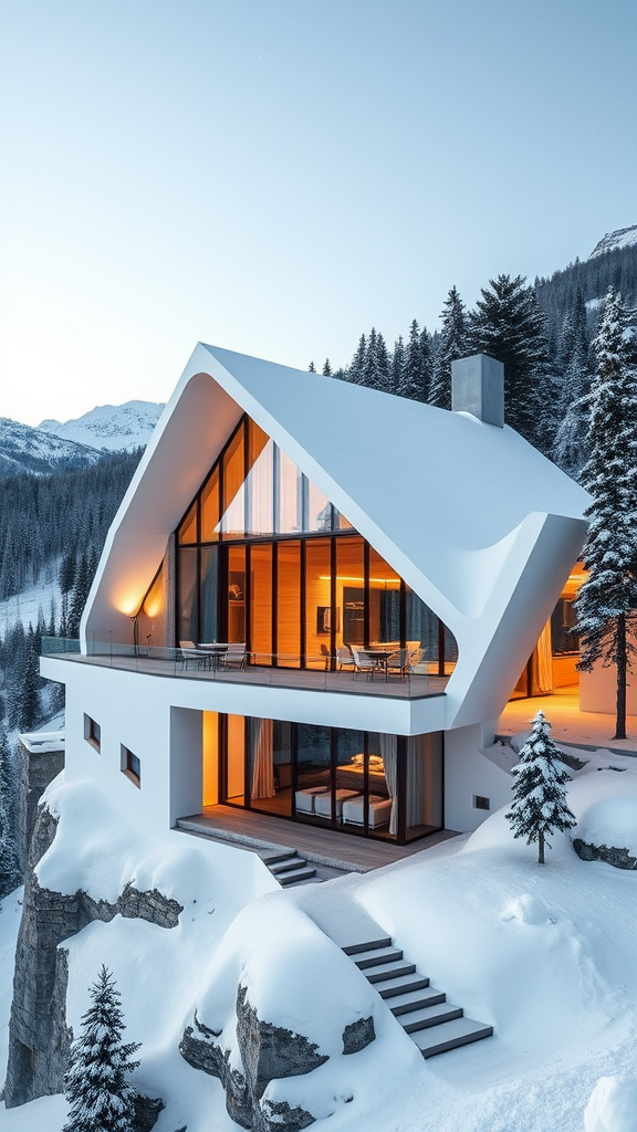 A state-of-the-art luxury Swiss home perched on a mountain, featuring sleek white walls and expansive triangular windows. The structure boasts curved and unconventional forms, blending seamlessly with its snowy surroundings and pine forests. Crafted from a mix of wood and concrete, the residence displays large windows and a minimalist design. The open-plan living spaces are accentuated by glass walls, while the rooftop deck offers breathtaking mountain panoramas. Inspired by the styles of Bjarke Ingels, Zaha Hadid, and Frank Gehry, the house is characterized by clean lines and a meticulously detailed, sharp focus.