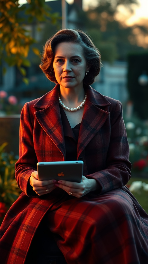 A stately woman in a rich, autumnal plaid coat and dress, sitting regally in a garden at dusk, tablet in hand, bathed in the warm glow of volumetric lighting that casts shadows and highlights on her serene expression and elegant features, captured in exquisite detail with the Kodak Portra 400 film format, translated into a stunning 8k digital image with subtle low contrast and a cinematic aspect ratio of 9:16, shot in a single take from a distance that emphasizes her poise and quiet confidence, the backdrop of the garden a soft blur of foliage and flowers, the focus entirely on the subject in all her refined beauty and serenity.