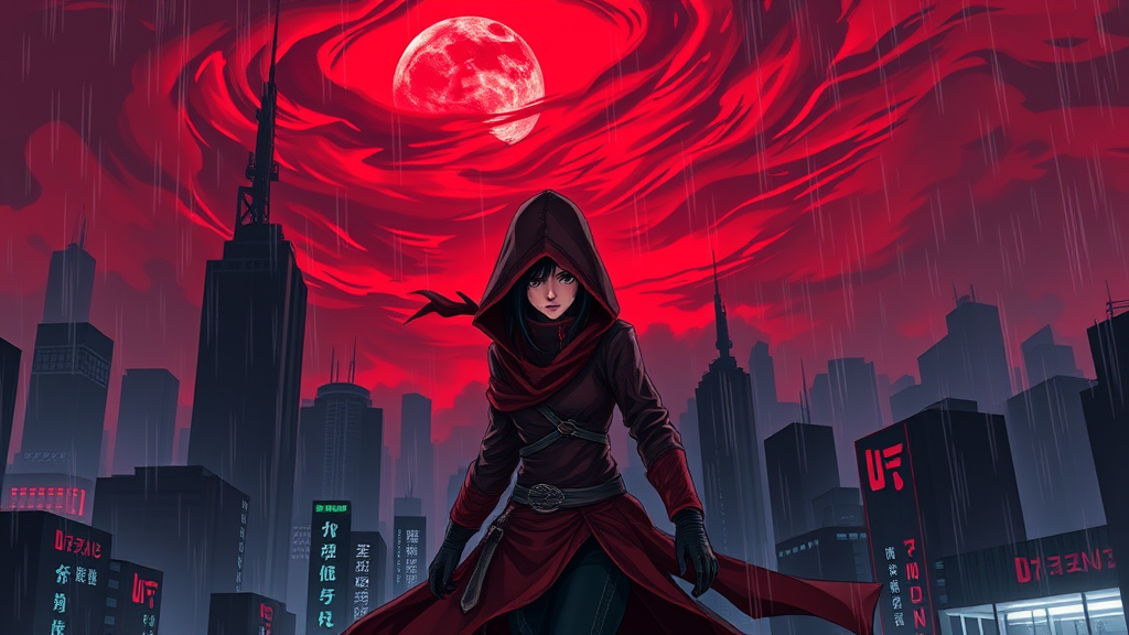 A stealthy female assassin ninja, cloaked in a sleek red and black outfit, prowls through the night. The backdrop features a cityscape of towering black and red buildings, shrouded in a thick, dark fog. The sky above is a dynamic tapestry of vibrant colors; it glows with a menacing red, punctuated by swirling crimson clouds and an ominous red moon. The atmosphere is heavy with ominous weather as rain cascades down, reflecting the neon glimmer of cyberpunk fluorescent lights that pierce through the gloom. This scene, rich with anime-inspired, hybrid artistry, captures a tension-filled moment in a world where tradition and futurism collide.