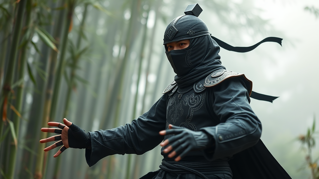 A stealthy male ninja clad in full-body armor, intricately decorated with subtle patterns, moves gracefully through the misty forest. He wears sleek wireless headphones, from which the soothing melodies of a classical symphony can be faintly heard. Amidst towering bamboo and whispering winds, he practices Tai Chi, his movements fluid and harmonious, embodying a serene dance of disciplined martial prowess and tranquil meditation.