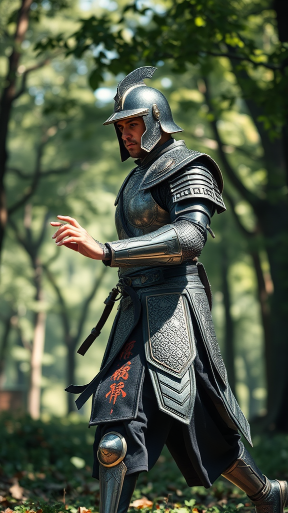A stealthy male warrior clad in an intricately detailed full-body suit of armor moves elegantly through a serene forest glade, wireless earbuds tucked beneath his helmet, soothing classical melodies guiding his precise tai chi movements as soft sunlight filters through the leaves, casting a dappled glow on his fluid motions.