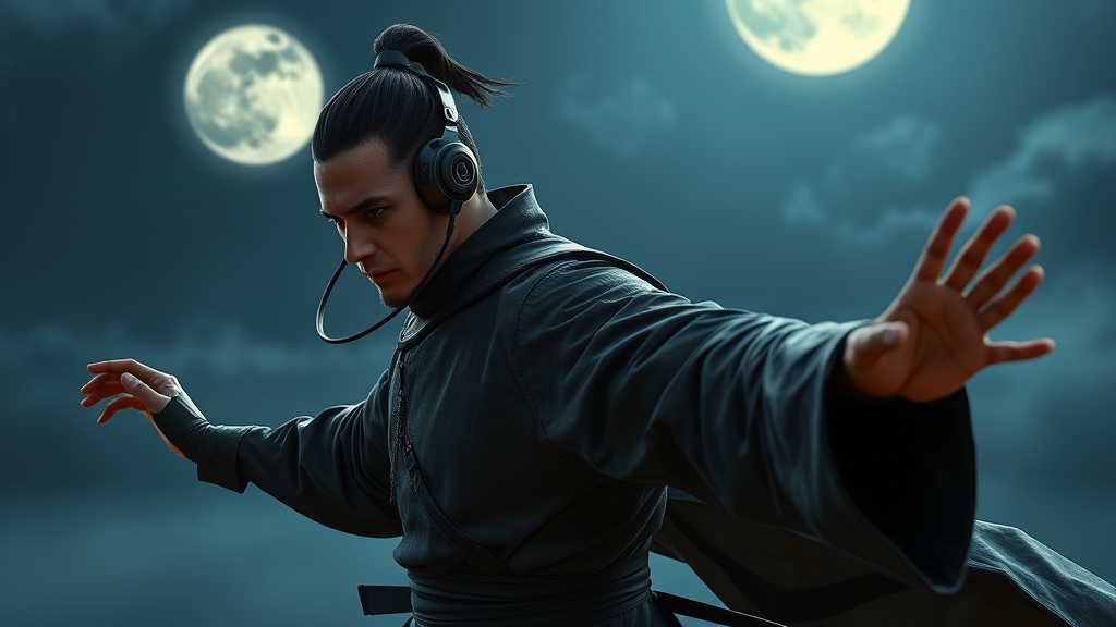 A stealthy male warrior encased in sleek, shadowy armor moves gracefully under the moonlit sky, wireless headphones enveloping him in the serene world of classical compositions as he executes Tai Chi forms with fluid precision.